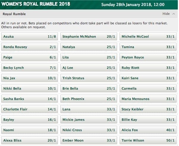As of this writing, Asuka is currently the heavy favorite to win the Women’s first-ever Royal Rumble match that takes place later this month at the Royal Rumble pay-per-view event. She sits at 11/8, while Ronda Rousey is the second favorite to win.